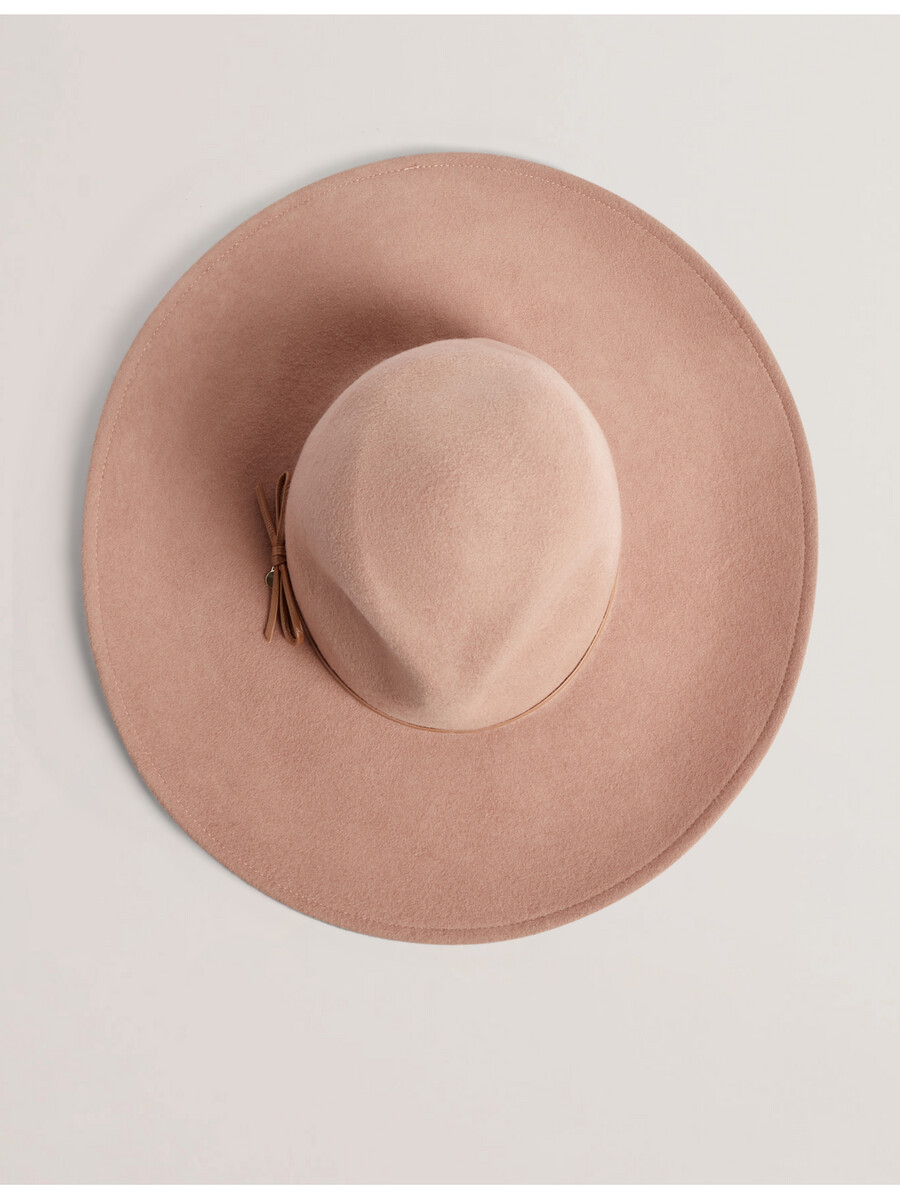 Fedora šešir Široki obod Tkanina od čiste vune Tanki kožni obrub Detalj s mašnom i metalnim privjeskom u obliku slova T T-traka za znoj Vanjski dio: 100% vuna; Obrub: 100% ovčja koža Ne prati, ne peglati, ne kemijski čistiti
