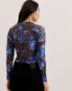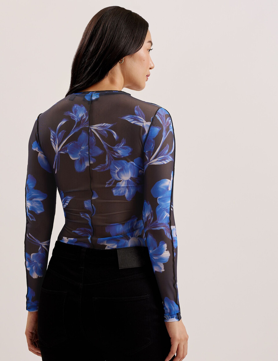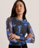 Top dugih rukava Kontrastni cvjetni print Prozirna mrežasta tkanina Detalj s podignutim šavovima Podstavljeni prednji gornji dio Okrugli izrez Uski kroj Chae je visoka 177 cm i nosi Ted veličinu 1 95% poliester 5% elastan