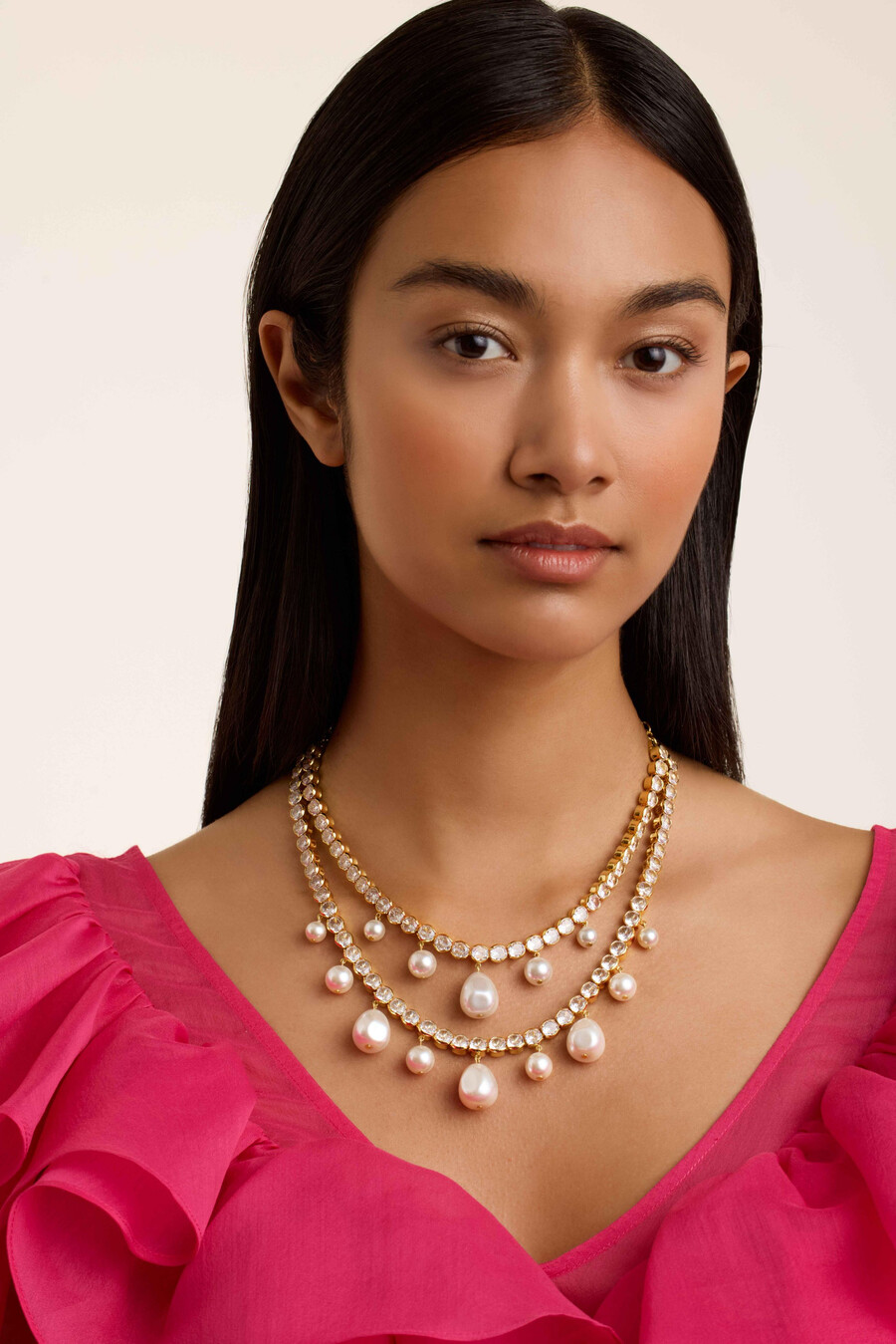 Zablistajte ulaskom u svijet ogrlice Divinaa s biserima i kristalima Ted Baker. Raskošni slojeviti lančići od finog europskog kristala i kaskadnih kapljica umjetnog bisera. Ogrlica je završena zlatnom prevlakom i ima podesivi produžni lančić. Dolazi s poklon kutijom s robnom markom Ted Baker. • Kolekcija Glamour Pearl • Ogrlica s upečatljivim detaljima • Fini europski kristal • Umjetni biseri • Podesivi lančić • Zlatna prevlaka s prozirnim kristalom 55% mesing, 30% kristal, 15% stakleni biseri, 100% zlatna prevlaka. Uvijek stavite svoj nakit Ted Baker kao završni detalj nakon bilo kakvih parfema ili sprejeva. Držite podalje od vode, kreme za sunčanje, losiona, dezinficijensa za ruke i drugih kemikalija poput klora. Za čišćenje preporučujemo korištenje samo meke krpe – sve kemikalije ili tekućine za poliranje istrošit će prevlaku. Nakit treba pažljivo čuvati u priloženoj ambalaži. Uvijek zapamtite: To bi trebala biti posljednja stvar koju stavite ujutro i prva stvar koju skinete navečer.