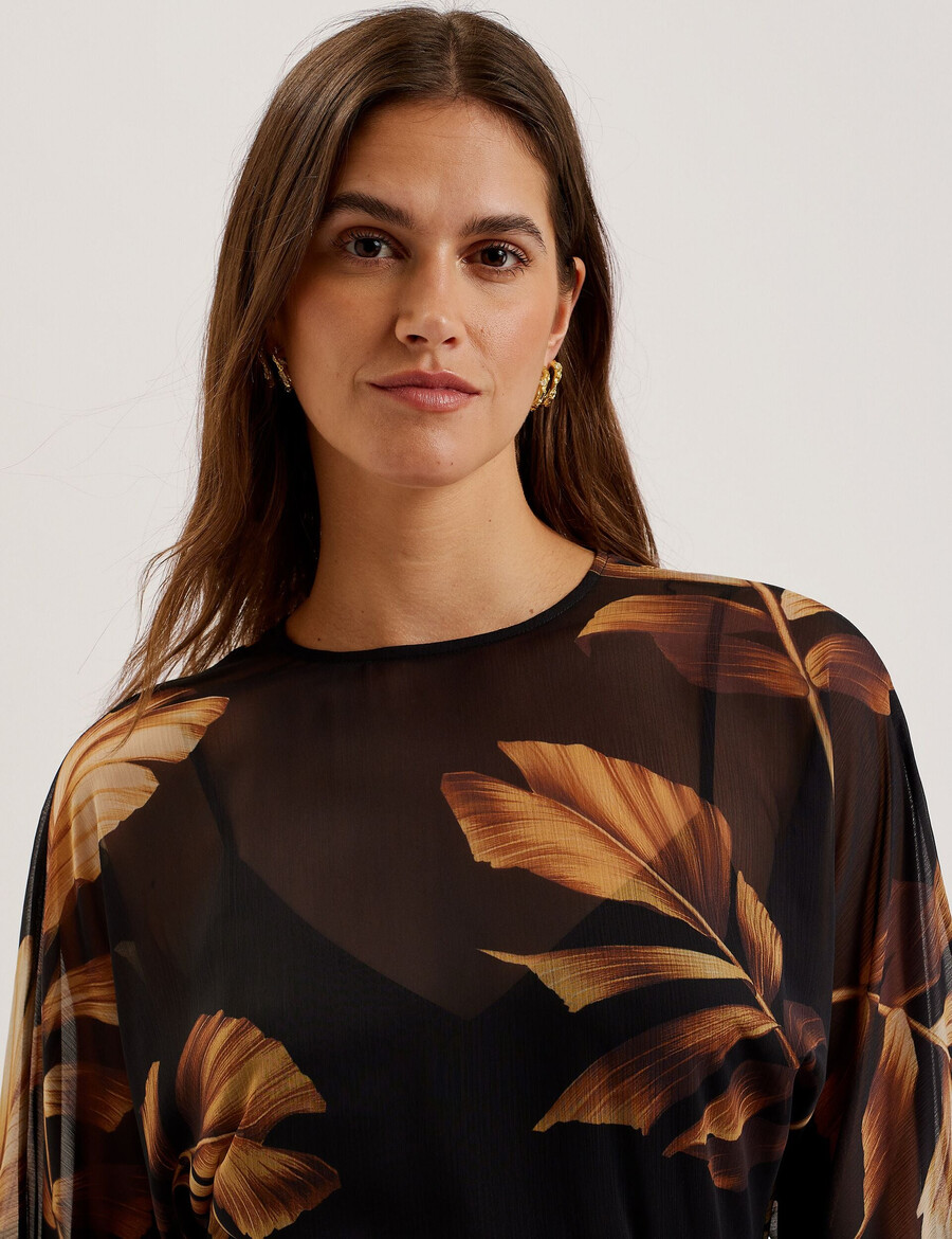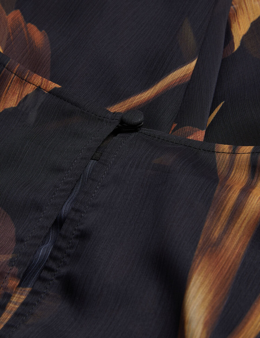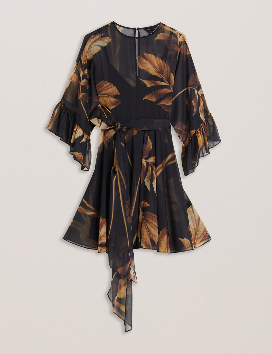Mini haljina od šifona s velikim uzorkom listova Poluprozirna tkanina s naborima Pola rukava s volanima Remen s vezanjem u struku Okrugli izrez Kopčanje patentnim zatvaračem i gumbima s rupicom za ključanicu Amy je visoka 177 cm i nosi Ted odjeću veličine 1 Materijal: 100% poliester; Podstava: 100% poliester Prati na programu za vunu, glačati na hladno, Može se kemijski čistiti