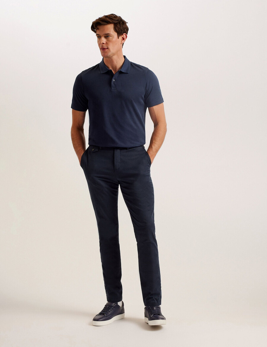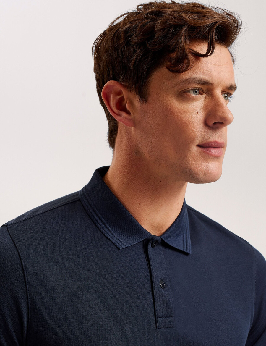 Polo majica Klasični ovratnik s rebrastim detaljem Mješavina pamuka Kopčanje na gumbe Regular kroj Kratki rukavi Lewis je visok 188 cm i nosi mornarsko plavu majicu Ted veličine 3 55 % poliester, 45 % pamuk Pranje u perilici rublja na 30 °C, može se kemijski čistiti