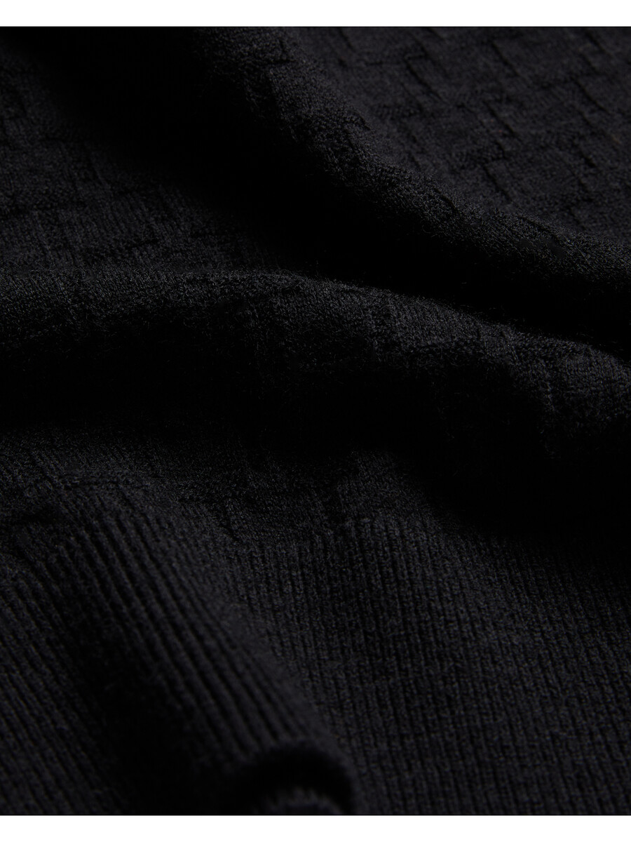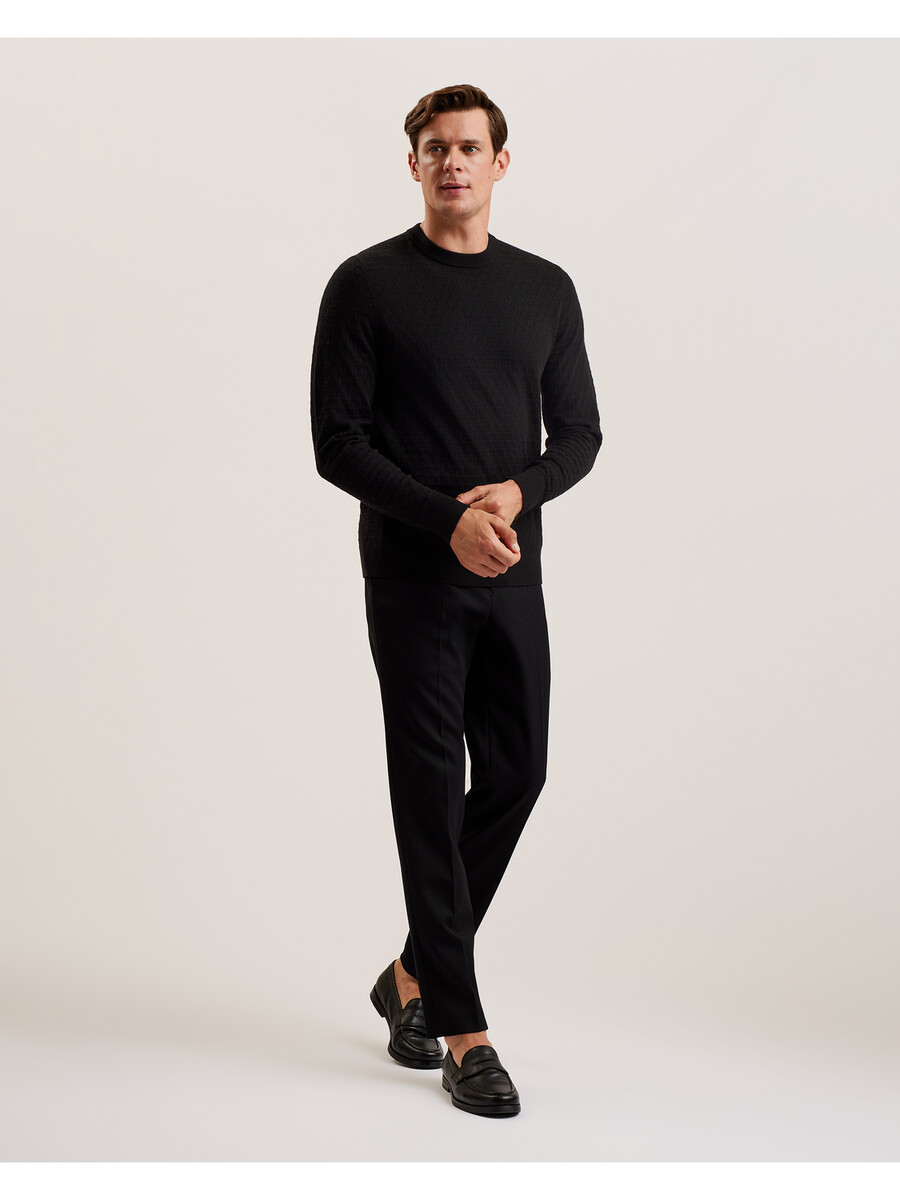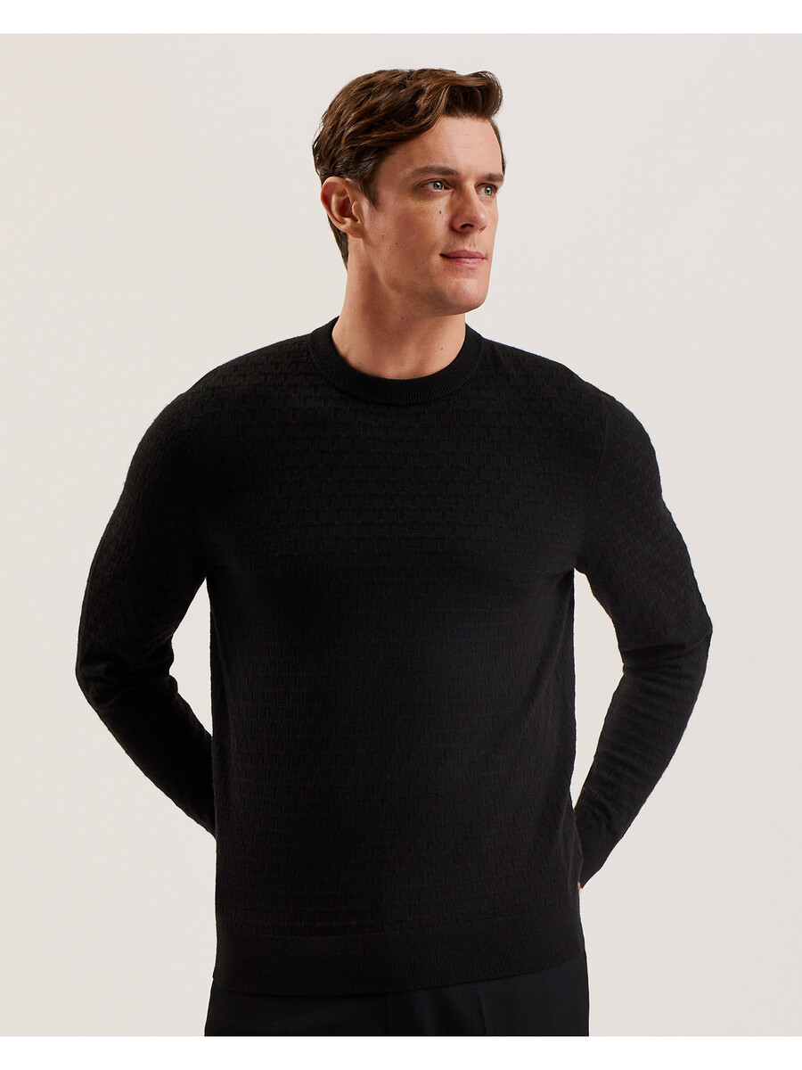 Džemper dugih rukava Pletenina od mješavine vune Teksturirani T uzorak Okrugli izrez Rebrasti rubovi Lewis je visok 188 cm i nosi crnu boju u Ted majici veličine 3 32% poliester, 31% poliamid, 28% akril, 7% vuna, 2% elastan Pranje u perilici rublja na 30°C, ne kemijski čistiti