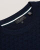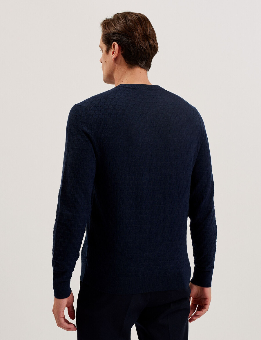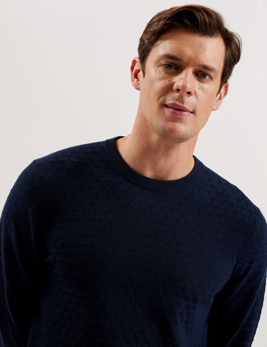 Džemper dugih rukava Pletenina od mješavine vune Teksturirani T uzorak Okrugli izrez Rebrasti rubovi Lewis je visok 188 cm i nosi mornarsko plavu majicu Ted veličine 3 40% poliester, 30% akril, 20% poliamid, 10% vuna Pranje u perilici rublja na 30°C, ne kemijski čistiti