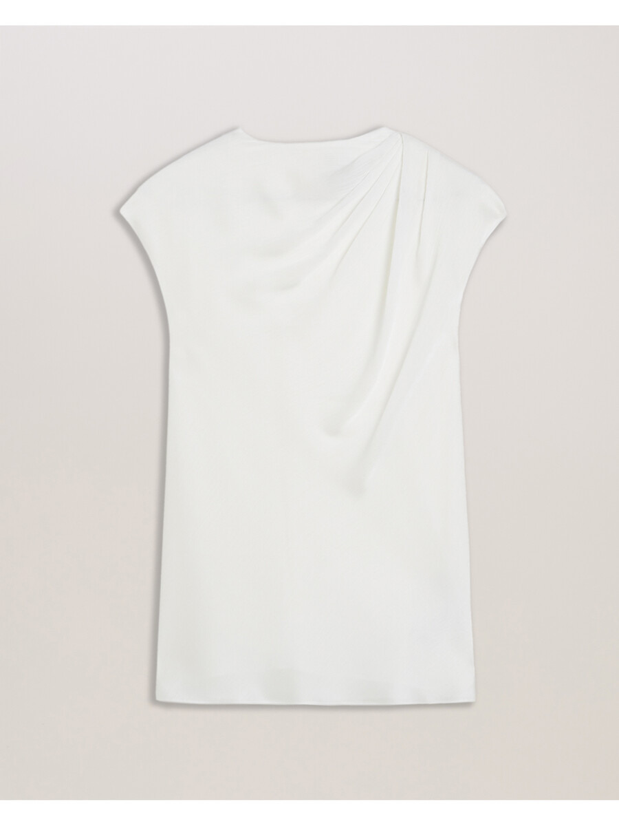 Satenski top Drapirani visoki ovratnik Nabrani detalj na ramenima Naborana tekstura Kapasti rukavi Ravni kroj Skriveno zatvaranje patentnim zatvaračem Stephanie je visoka 174 cm i nosi boju slonovače u Ted veličini 1 Materijal: 100% poliester; Podstava: 100% poliester Ručno pranje, glačanje s jednom točkicom, kemijsko čišćenje