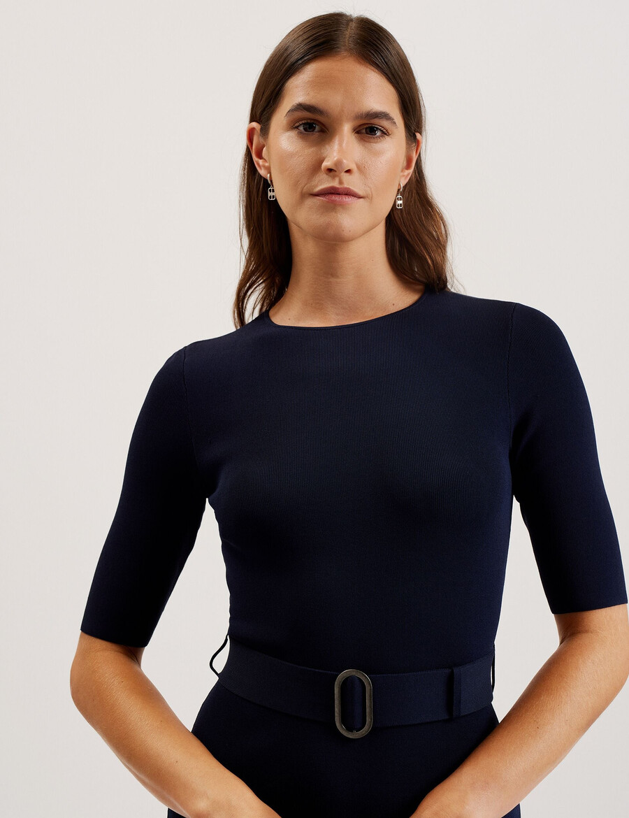 Uska midi haljina Pletena tkanina s rastezljivim materijalom Asimetrični preklopni rub Pola rukava Okrugli izrez Pričvršćeni remen s metalnim prstenom Zatvaranje patentnim zatvaračem Amy je visoka 177 cm i nosi tamnoplavu boju u Ted haljini veličine 1 Sastav: 67 % viskoza, 31 % poliamid, 2 % elastan 30 stupnjeva osjetljivo pranje, hladno glačanje, Može se kemijski čistiti