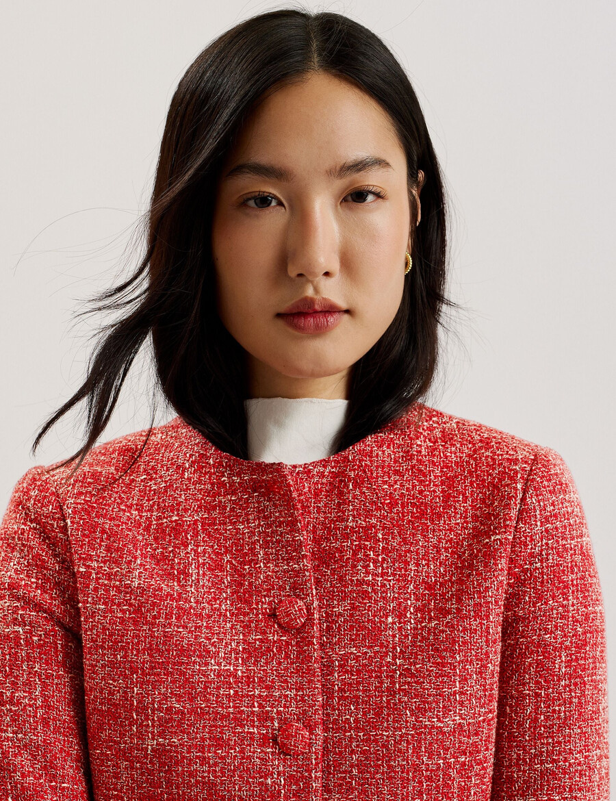 Krojena jakna Tkanina s bukle teksturom Skraćena duljina Okrugli izrez Kopčanje na gumbe Podstavljena ramena Dugi rukavi Chae je visoka 177 cm i nosi Ted veličinu 1 Glavna tkanina: 37% pamuk, 36% poliester, 19% viskoza, 7% lan, 1% poliamid; Podstava tijela: 50% viskoza, 50% acetat; Podstava rukava: 100% poliester